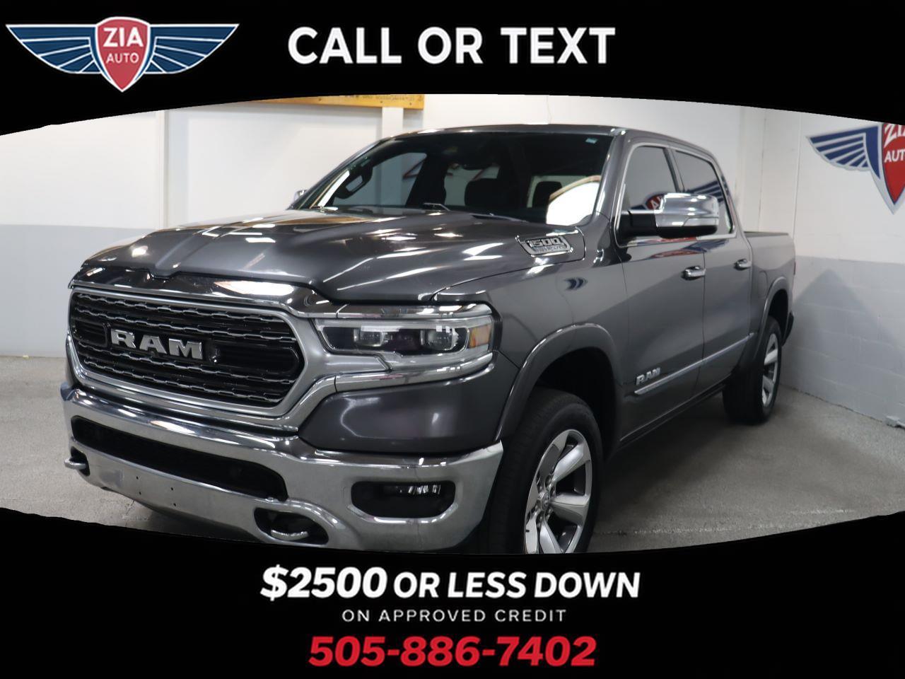 Enjoy hardcore capability in our 2019 RAM 1500 Limited Crew Cab 4X4 that's ready to make a strong impression in Granite Crystal Metallic! Motivated by a 5.7 Liter HEMI V8 that offers 395hp matched to a responsive 8 Speed Automatic transmission for amazing towing capability. This Four Wheel Drive truck also delivers steady handling on the road or the trail thanks to an active air suspension, and it achieves nearly 21mpg on the highway while showing off a design that evokes power and prestige with LED lighting, fog lamps, power running boards, and bold alloy wheels.Even when it's hard at work, our Limited lets you relax with leather heated/ventilated front and rear seats, a leather heated steering wheel, power-adjustable pedals, dual-zone automatic climate control, and advanced technology anchored by an 8.4-inch touchscreen. Use that or voice control to manage full-color navigation, Android Auto®, Apple CarPlay®, Bluetooth®, WiFi compatibility, and a 10-speaker Alpine audio system. And you and your whole crew will love the cab's roomy interior dimensions!Further confidence comes from RAM safety features such as a backup camera, blind-spot monitor, parking sensors, tire-pressure monitoring, hill-start assist, trailer-sway control, and advanced multistage front airbags. With all that and more, getting carried away with our impressive 1500 Limited is easy. Save this Page and Call for Availability. We Know You Will Enjoy Your ZIA Auto Test Drive Towards Ownership!